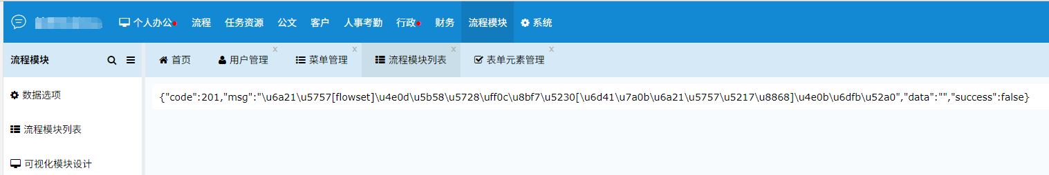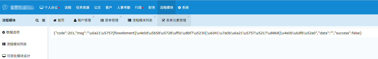 访问 流程模块--表单元素管理,就出现 模块 [flowelement] 不存在,请至 [流程模块列表] 下添加。