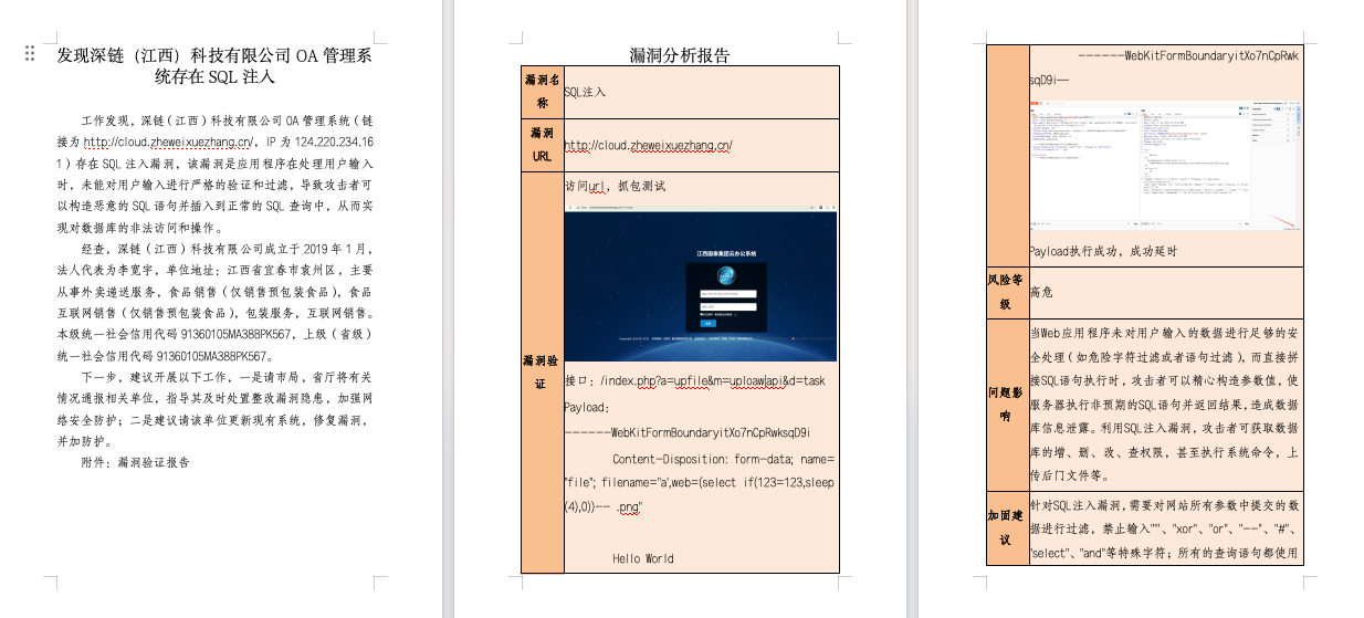 工作发现,深链(江西)科技有限公司OA管理系统(链接为http://cloud.zheweixuezhang.cn/,IP为124.220.234.161)存在SQL注入漏洞,该漏洞是应用程序在处理用户输入时,未能对用户输入进行严格的验证和过滤,导致攻击者可以构造恶意的SQL语句并插入到正常的SQL查询中,从而实现对数据库的非法访问和操作。